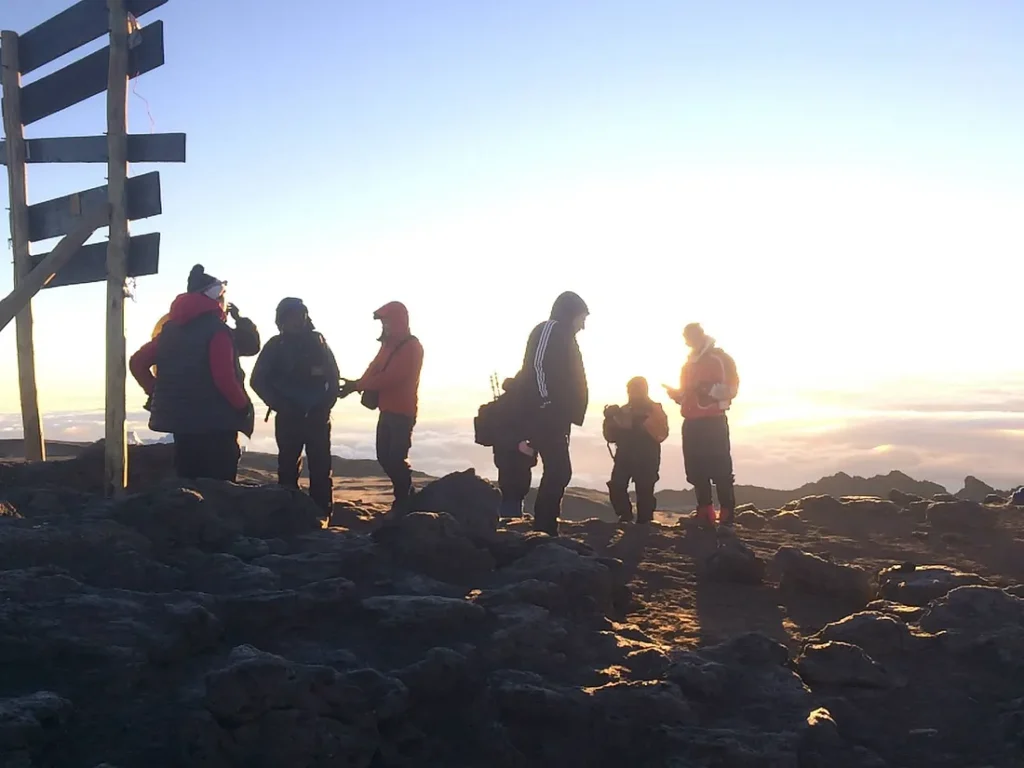 And yet the struggle is far from over. Poli, poli. Shuffling upward toward Uhuru peak I can feel my energy draining out behind me like the slime track of a snail. Each breath pulls in barely half the oxygen I would get at sea level. Step, crunch, step, crunch, and then, at last, I am here. I am standing on the rooftop of Africa. The earth continues to turn and the sun pierces the horizon.